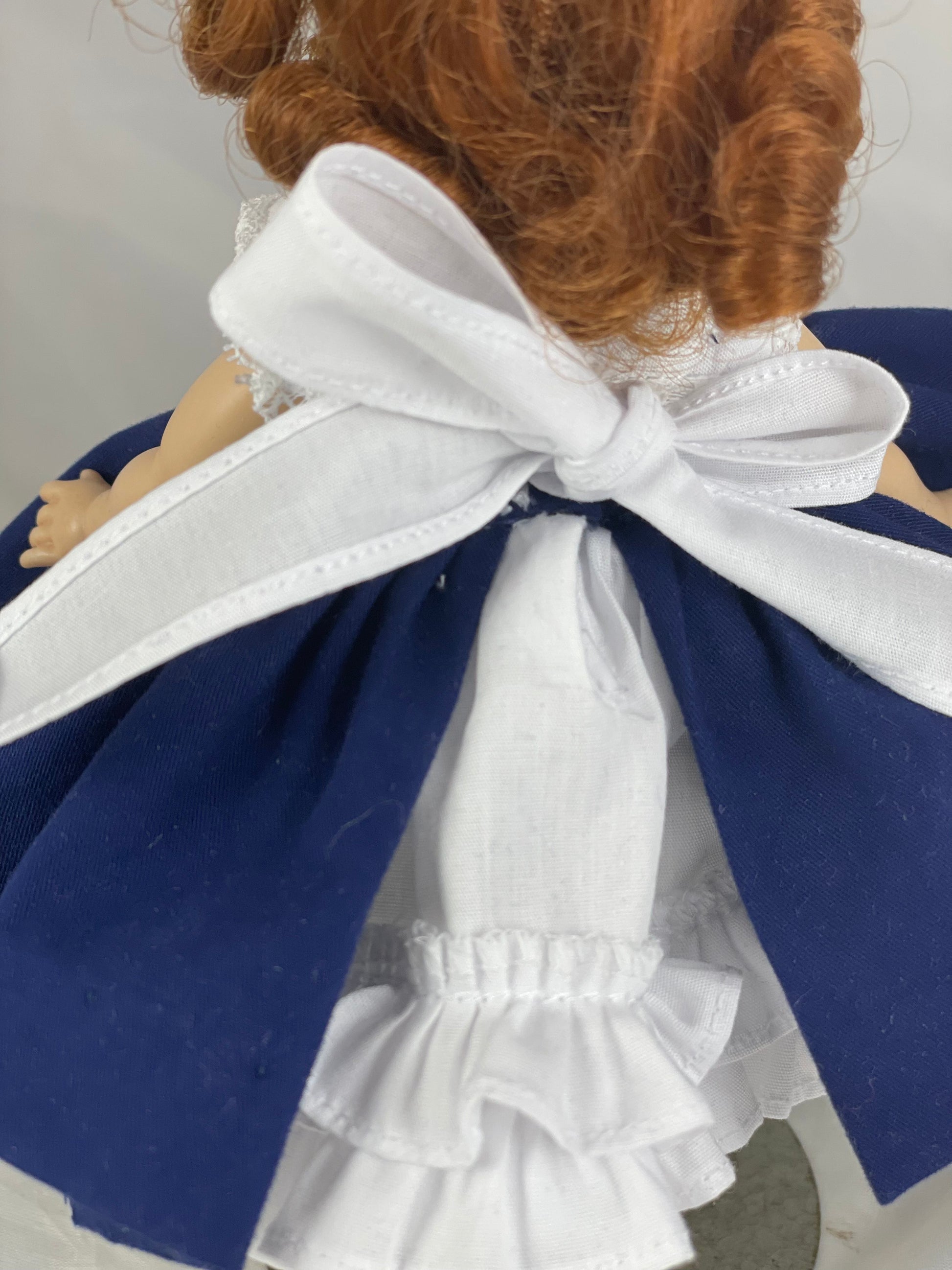 Navy and white ruffle dress, petticoat, bloomers and socks for 8” Madame Alexander doll